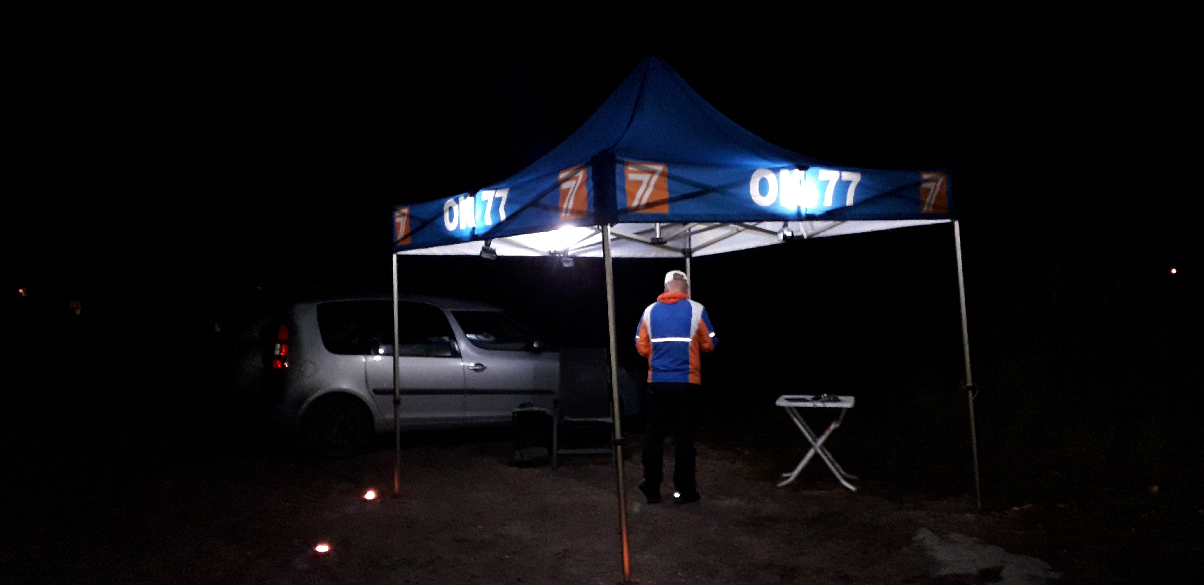 Kuva (Micke Berger, kuvitus). Päätöskisan tekniikkaosion (yösuunnistuksen) tunnelmia.