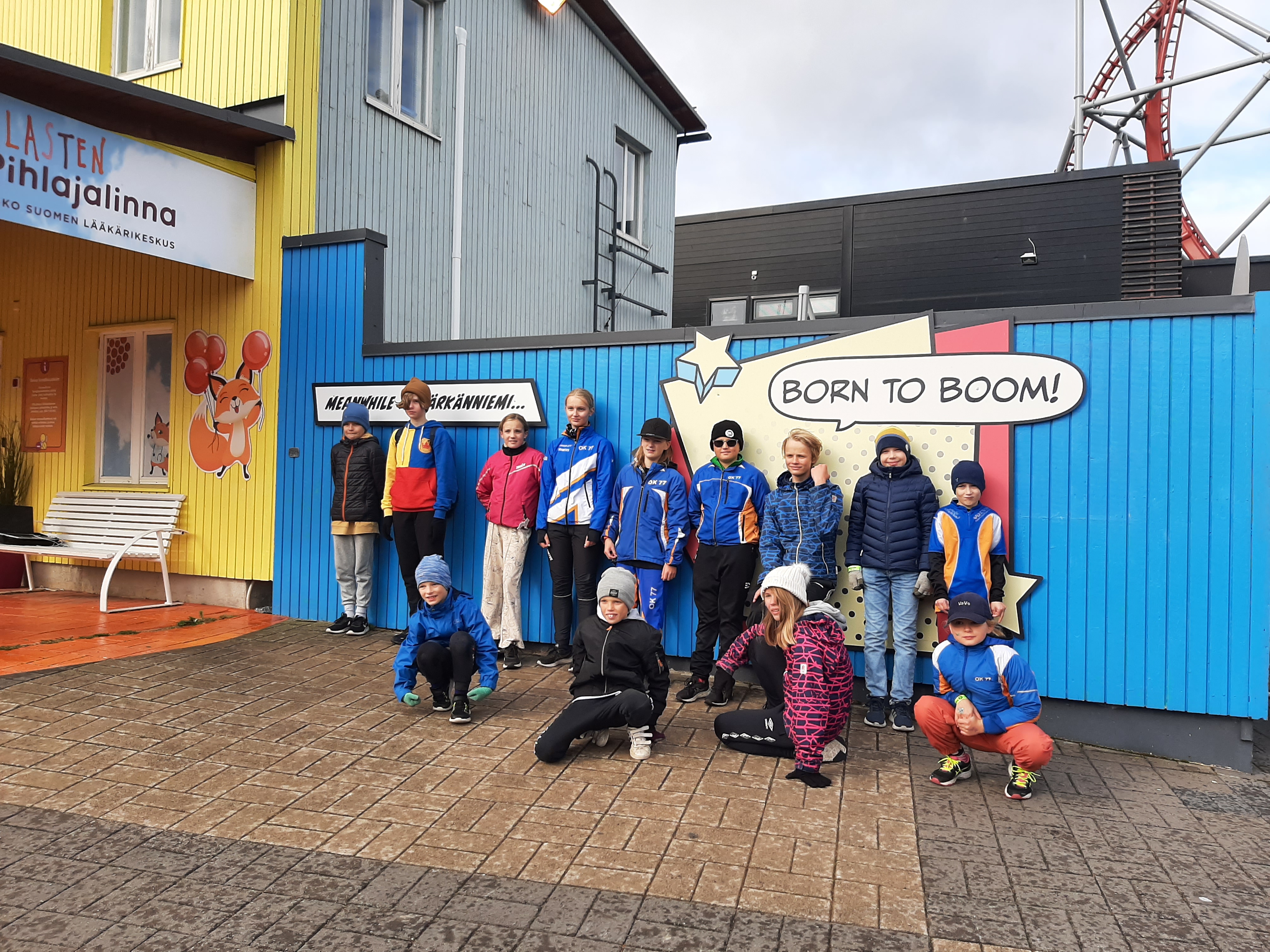 Seura oli liikkeellä 15 suunnistajan (jotka lähes kaikki mahtuivat kuvaan) voimin, tukenaan kourallinen aikuisia autonkuljettajina (ja rannekkeiden maksajina). Sää oli syksyisen vaihtelevaa - auringonpaistetta, pilvistä, sadekuuroja. Mutta jos sade ei päässyt kastelemaan, vahingon pääsi korjaamaan joko Tukkijoella tai Joutsenlammella. Karusellit ja muut härvelitkin testattiin ja hyviksi todettiin. Ilme säilyi iloisena iltaan asti.