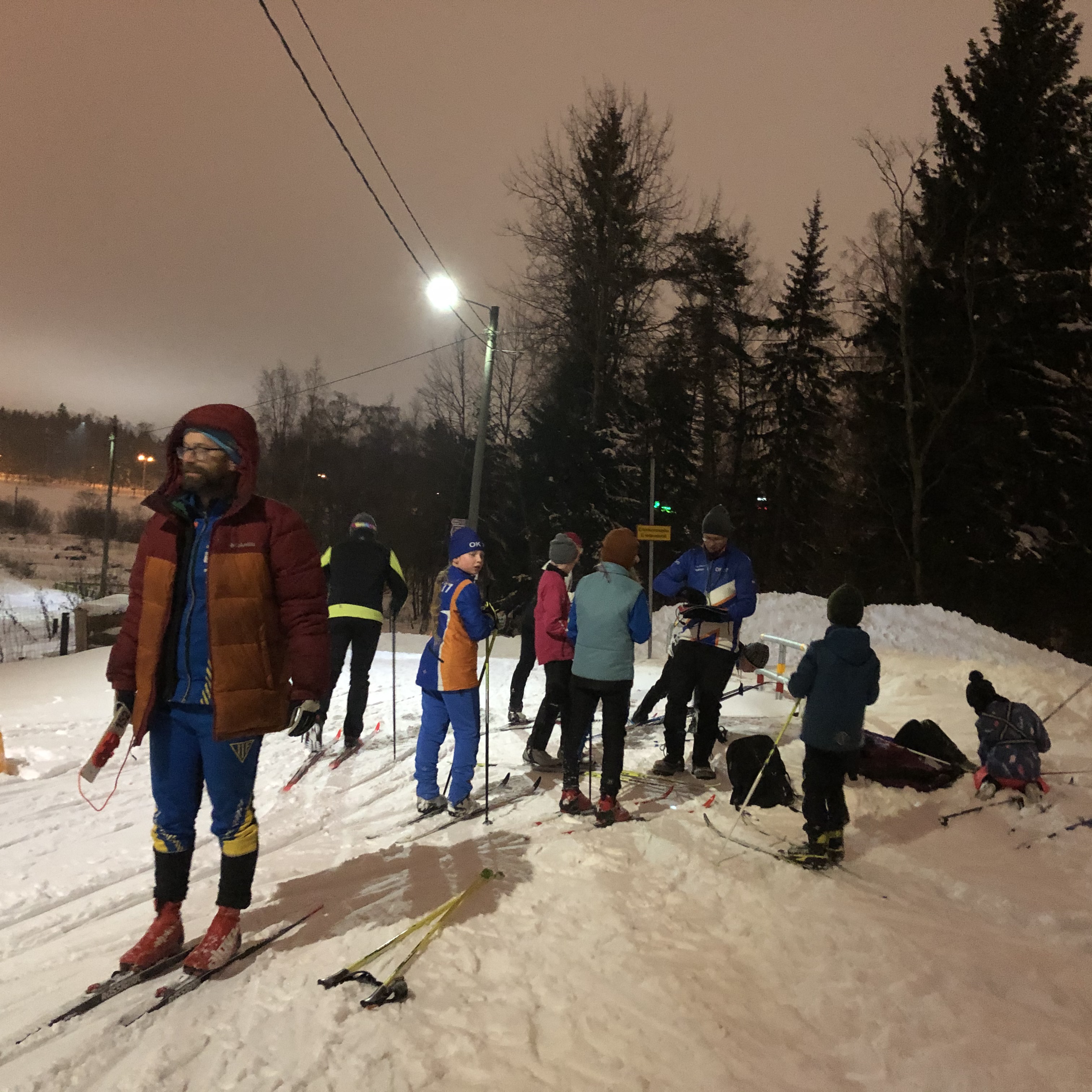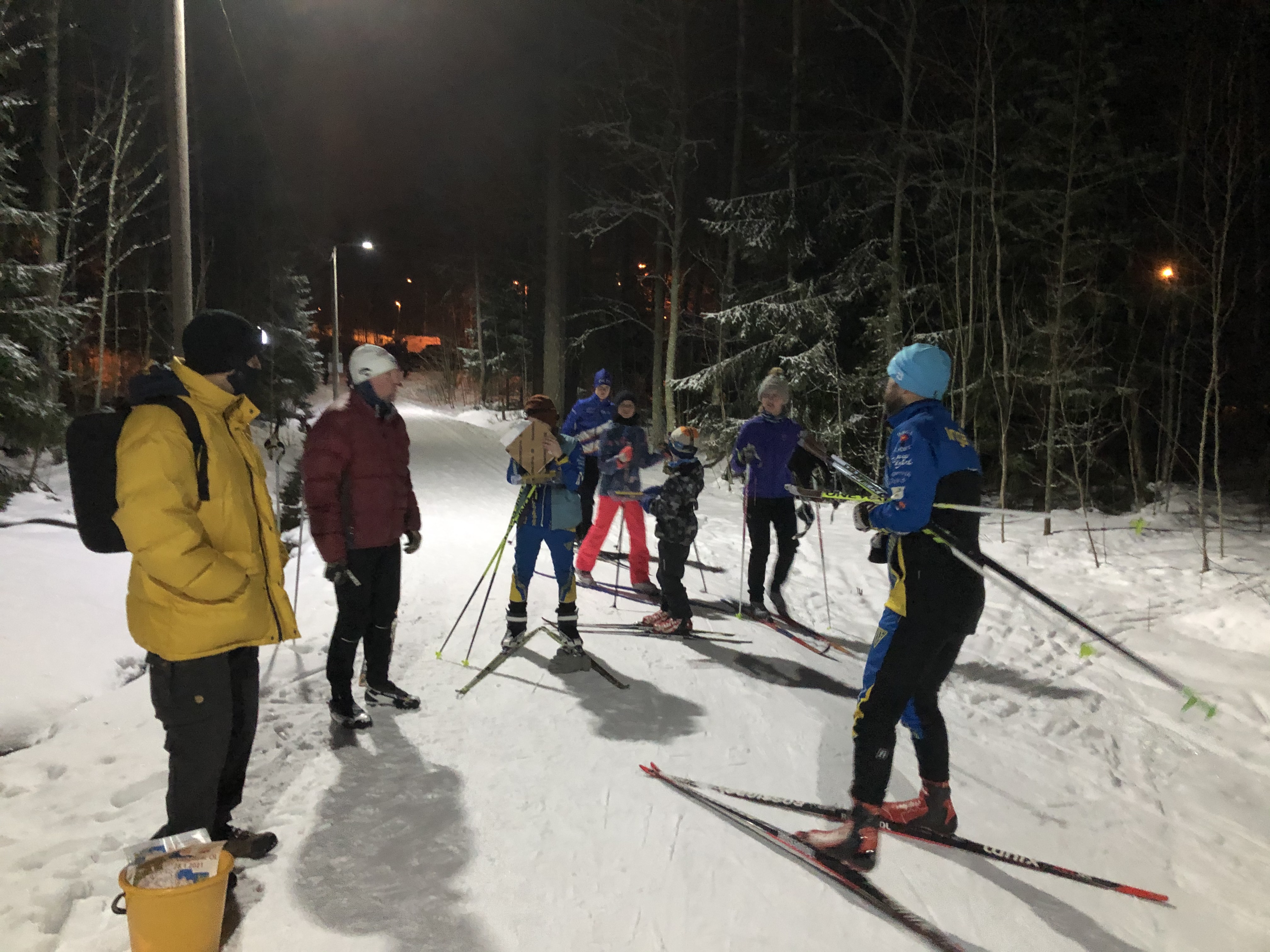 Paikalla oli pari tusinaa hiihtäjää, heidän joukossa kolme uutta TMO-kilpailijaa, kun periteinen hiihto suoritettiin Kuntokiharan radalla. Kilpailumatkana oli kaksi kilometrin pituista kierrosta, mutta alku- ja loppuverryttelyt mukaan lukien, kaikille tuli mittariin vähintään 3-5 km. Vaikka äkillinen lumentulo iski jo rusas viikko sitten, niin joillekin tämän iltainen hiihto oli talven ensimmäinen. TMO-kisasta näyttää muodostuvan Alexandra Backman'in ja Max Risku'n välinen kaksintaistelu. Tällä kertaa viime mainittu oli hiuksen hienosti parempi.