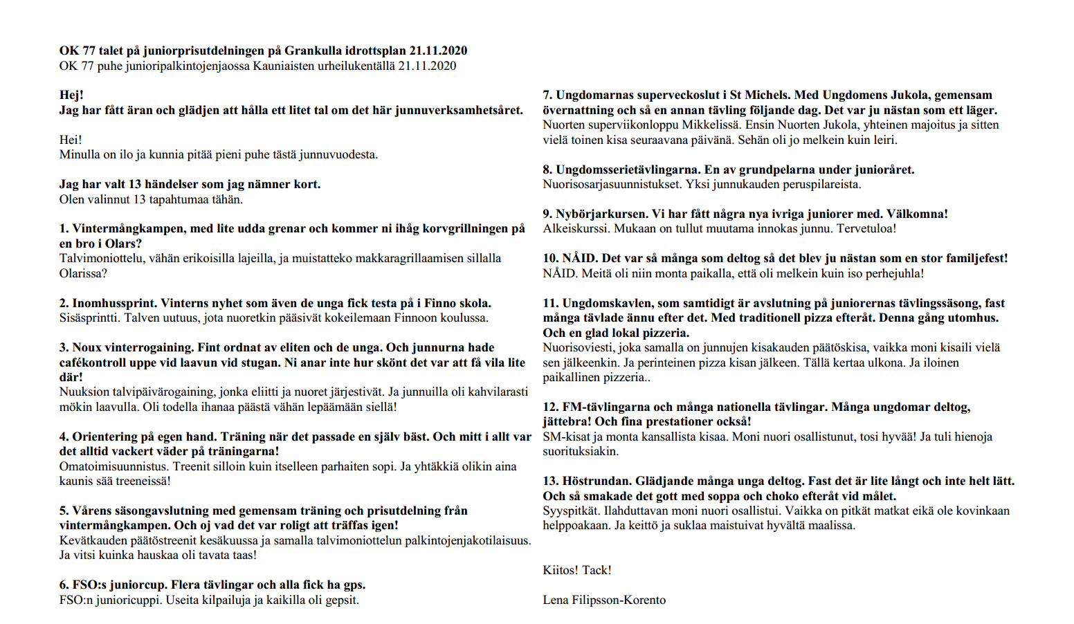 Lämminhenkistä tapahtumaa, loppusyksyn koleasta säästä huolimatta, juonsi Karin Mårtenson, apunaan koko juhlatoimikunta, jonka jäsen Lena Filipsson-Korento (seuran sihteeri) palkittiin vuoden juniorivetäjälle myönnetyllä Sinettipaadella, joka oli nyt jaossa viidennen kerran - Sinettiseurastatuksemme kunniaksi. Lena piti myös ansiokkaan ytimekkään 13 kohdan pituisen yhteenvetopuheen kuluneesta junnuvuodesta.