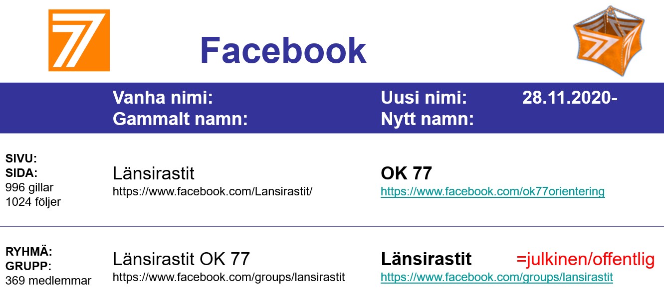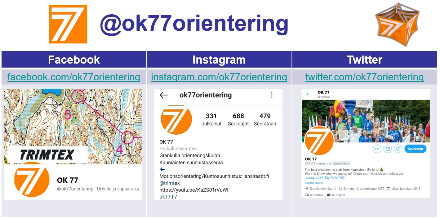 OK 77:n Facebook-sivun ja -ryhmien nimet ovat muuttuneet 28.11.2020. Olemme nyt @ok77orientering kaikissa some kanavissa: