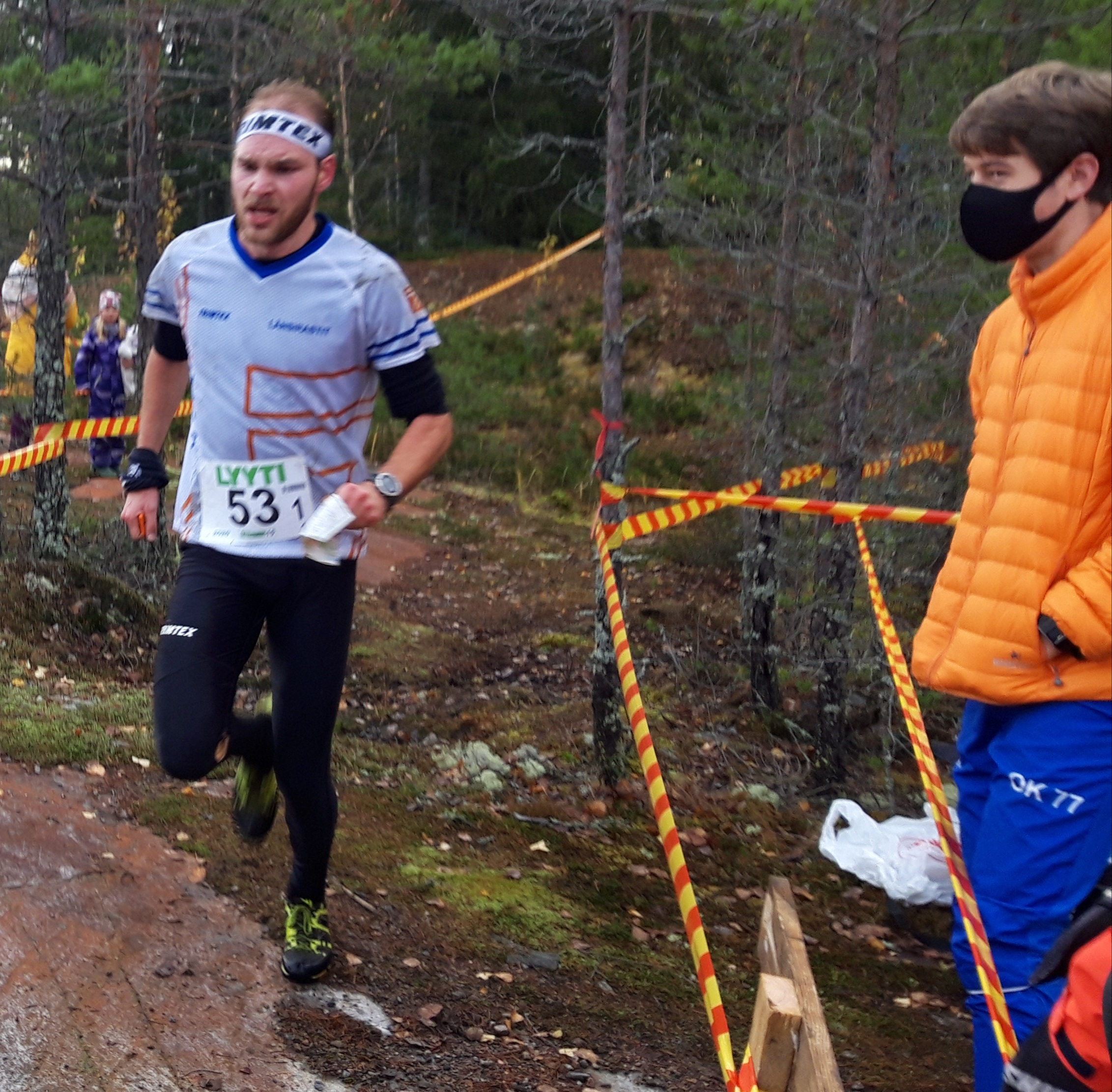 Kuva (Timo Tolkki): Jonathan "Jonis" Ray saapuu maaliin avausosuudelta sijalle 17. vajaa 2 minuuttia kärjestä. Jonny Donner seuraa asiaan kuuluvasti koronamaskin takaa.