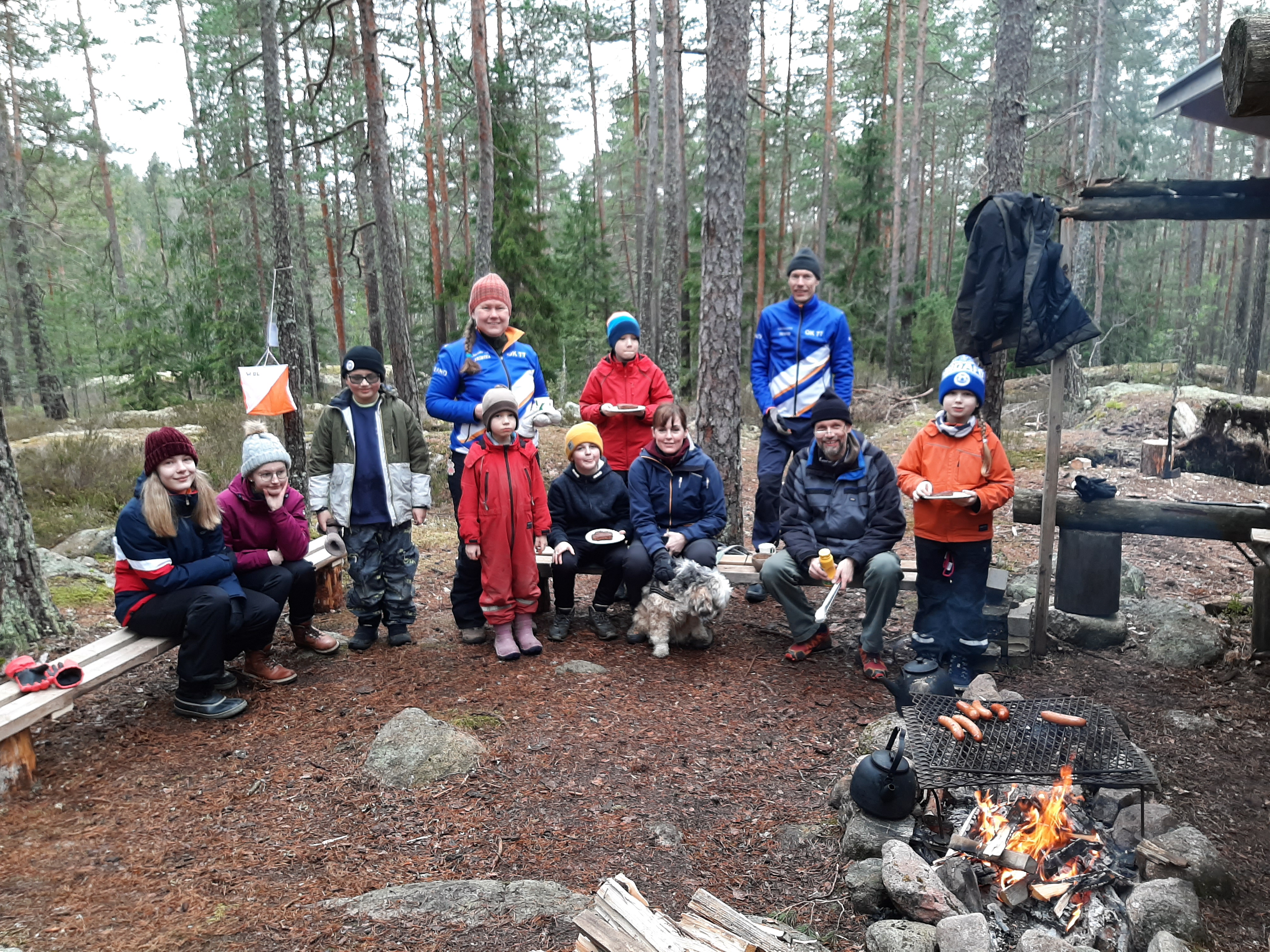 Foto (Henkka Backman). Juniorernas kioskkontroll vid Rojärvsbergets vindskydd. Kvalitetskontroll på grillkorven under arbete.