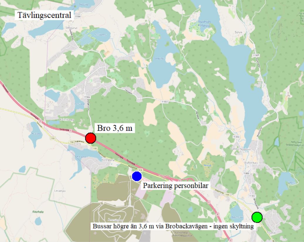 Underfarten under Åbo motorväg (E18/riksväg 1) vid Siikajärvivägen är endast 3,6 m hög. Bussar högre än 3,6 m skall vika av från väg 110 (Gamla Åbovägen) vid Brobackavägen mot Solvalla (ingen skyltning) och köra rutten Brobackavägen-Heinäsvägen-Siikajärvivägen-Snörportsvägen till tävlingscentralen. För noggrannare information vänligen kontakta tävlingens informatör.